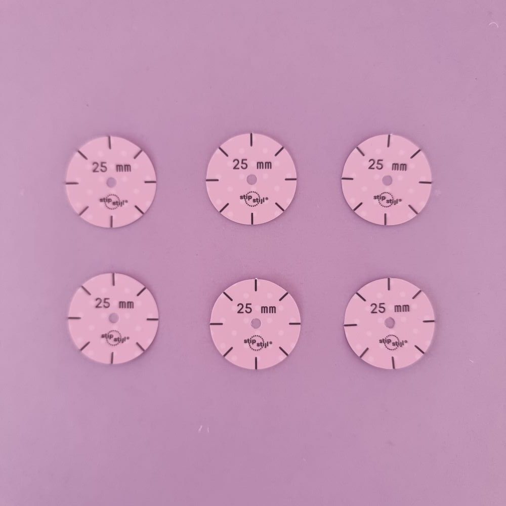 Met deze sjablonen maak je eenvoudig de basis van een mooi stippatroon. Deze set heeft maat 25 mm en bevat 6 stuks. Handig voor als je meerdere cirkels tegelijkertijd op je keramiek plaatst.