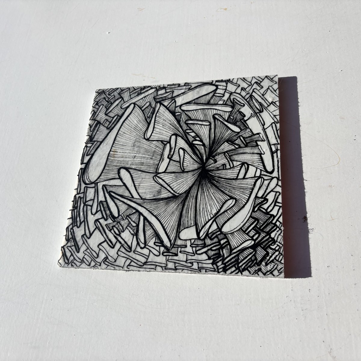 Studio Tosca werkt de plaat vervolgens af en zet er met acrylmarkers de fine line artworks op. Het werk kenmerkt zich door het spel van fijne lijnen. Deze lijnen nemen je stuk voor stuk mee. Brengen je verder of juist terug naar de basis. Bij elkaar vormen ze een geheel, zoals het leven.