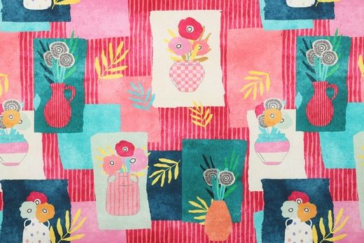 Mooie canvas stof met een digitale print van verschillende vazen by Nerida Hansen x Verhees Textiles.