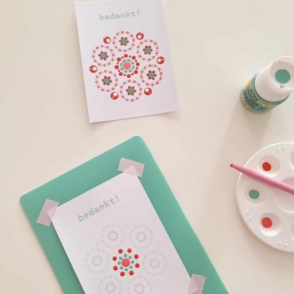 • Plak de kaart tijdens het stippen vast op een placemat met wat washitape. Dit stipt fijner, je kunt de kaart makkelijk draaien en de achterkant blijft schoon.