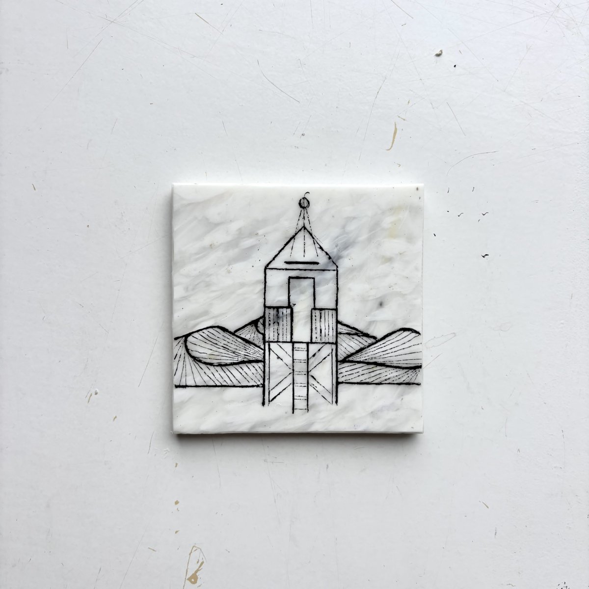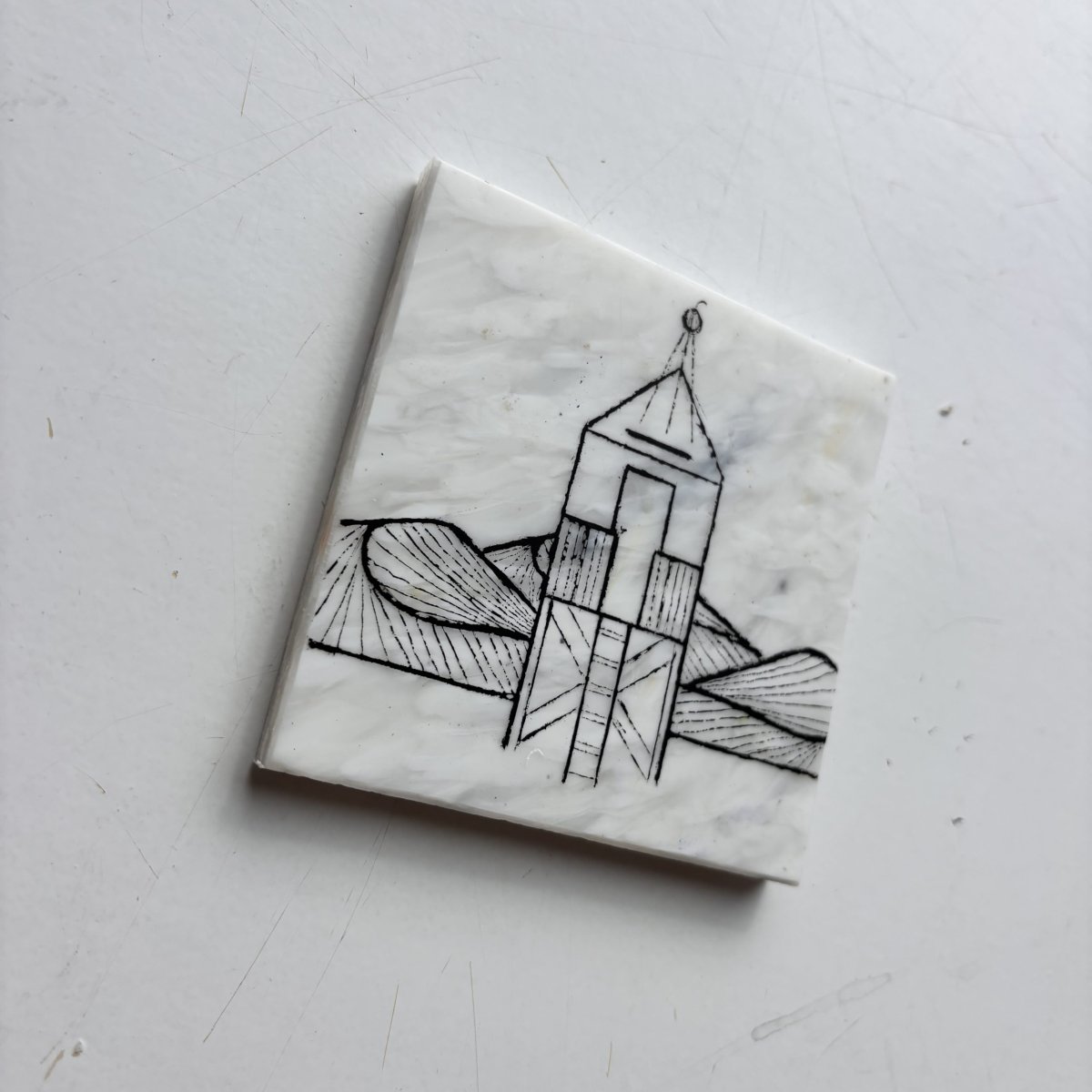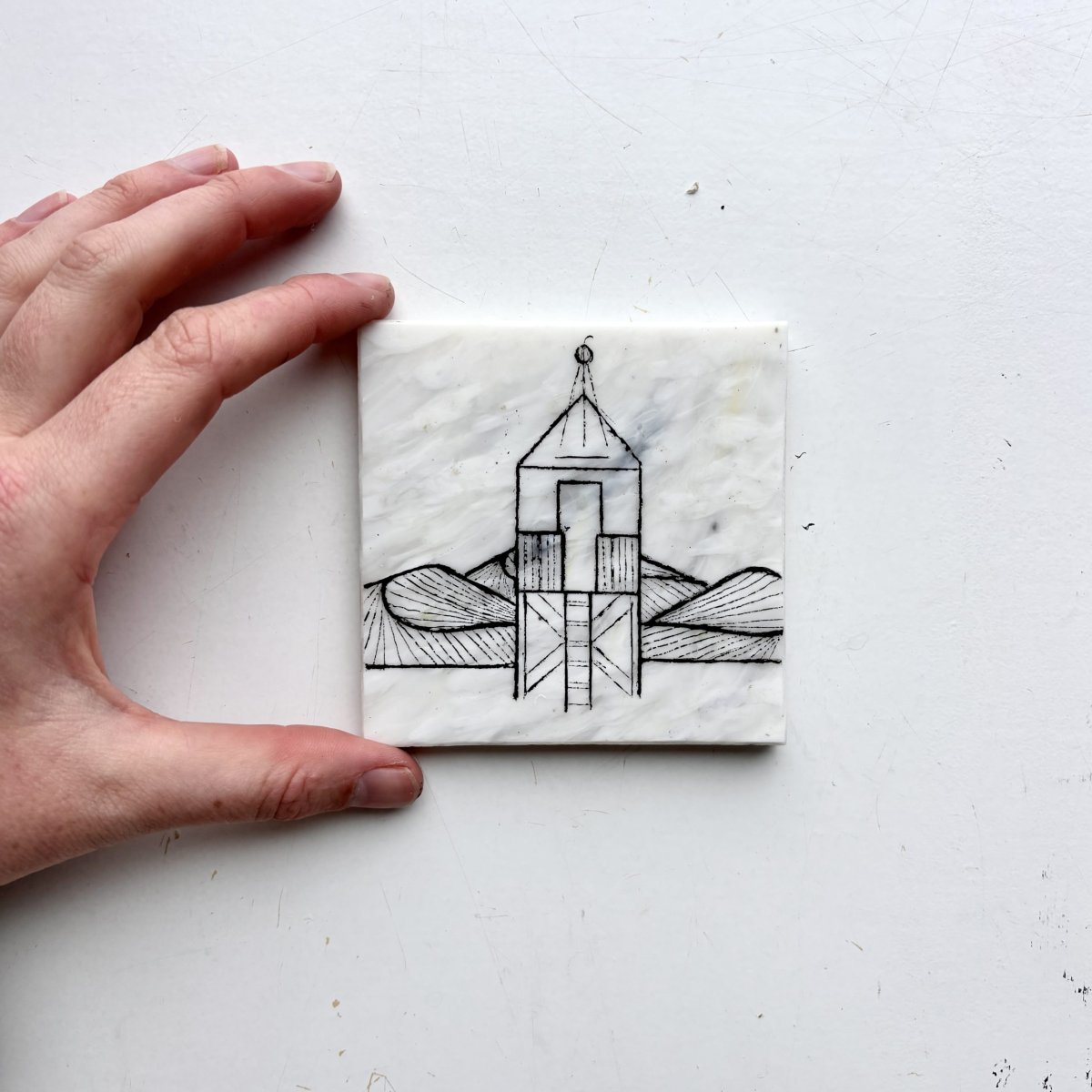De fine line artworks worden met de hand met acrylmarkers gezet op platen gemaakt van 100% recycled plastic. Hiervoor werken we samen met Circlefied, Jutfabriek Terschelling en TZO.