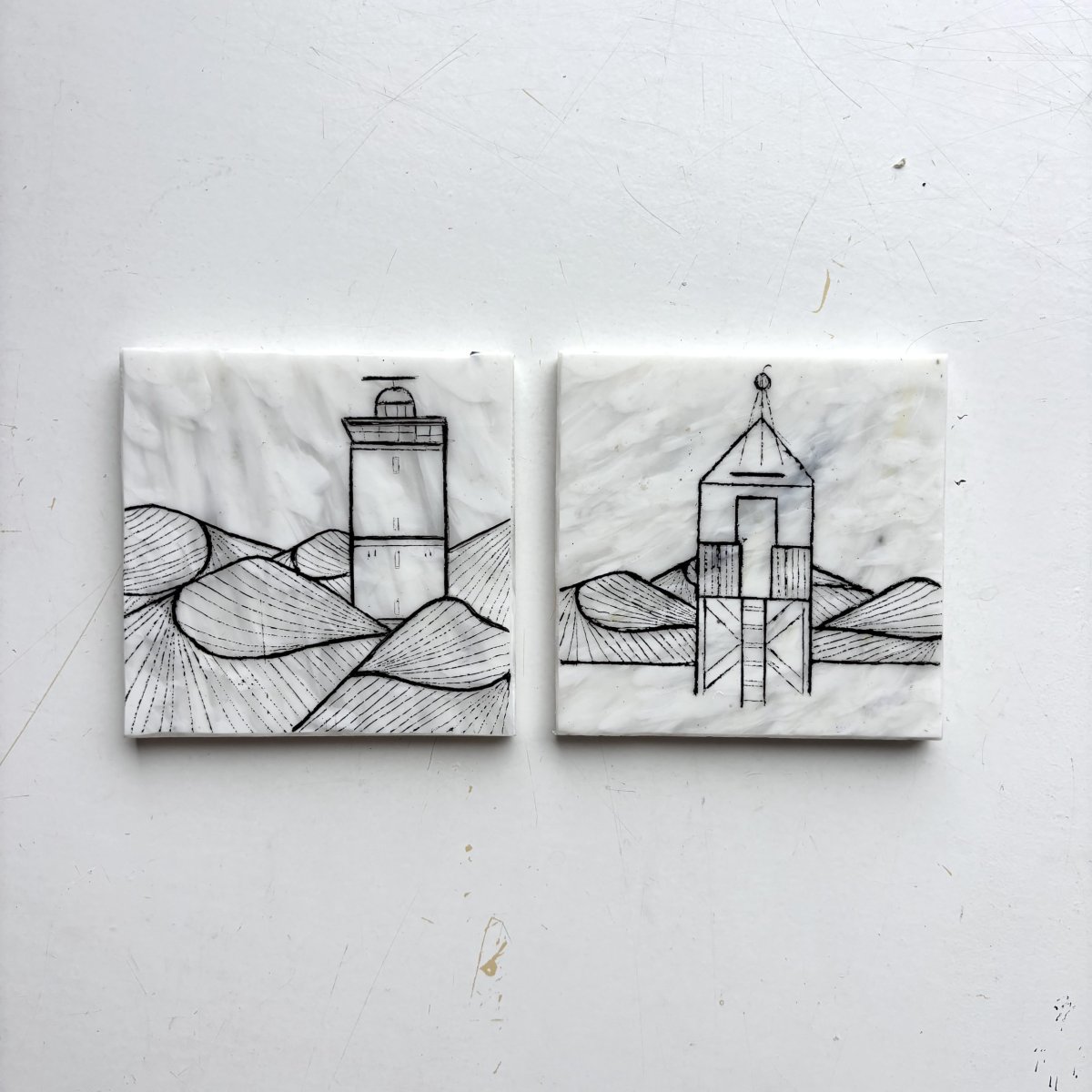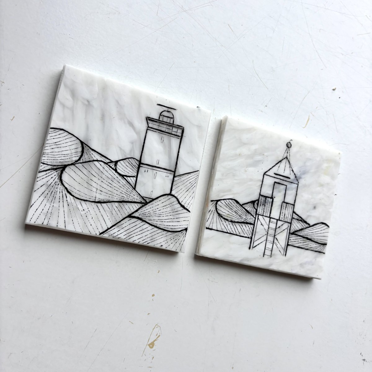 De fine line artworks worden met de hand met acrylmarkers gezet op platen gemaakt van 100% recycled plastic. Hiervoor werken we samen met Circlefied, Jutfabriek Terschelling en TZO.