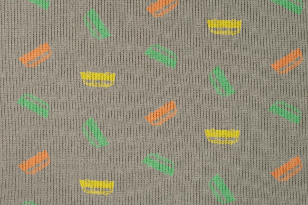 Fijne wafel stretch stof met een print van busjes uit het patroonblad Qjutie.