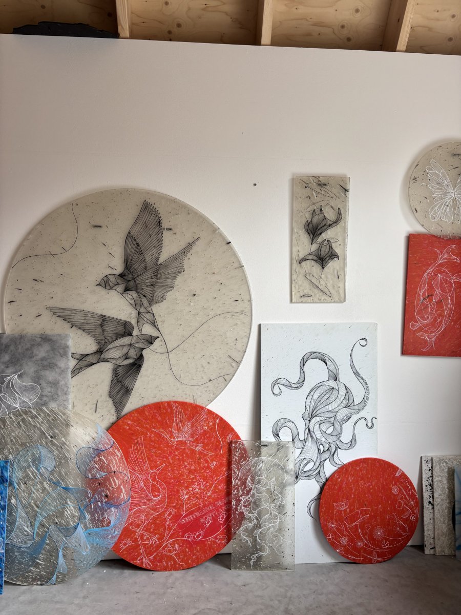 Studio Tosca werkt de plaat vervolgens af en zet er met acrylmarkers de fine line artworks op. Het werk kenmerkt zich door het spel van fijne lijnen. Deze lijnen nemen je stuk voor stuk mee. Brengen je verder of juist terug naar de basis. Bij elkaar vormen ze een geheel, zoals het leven.