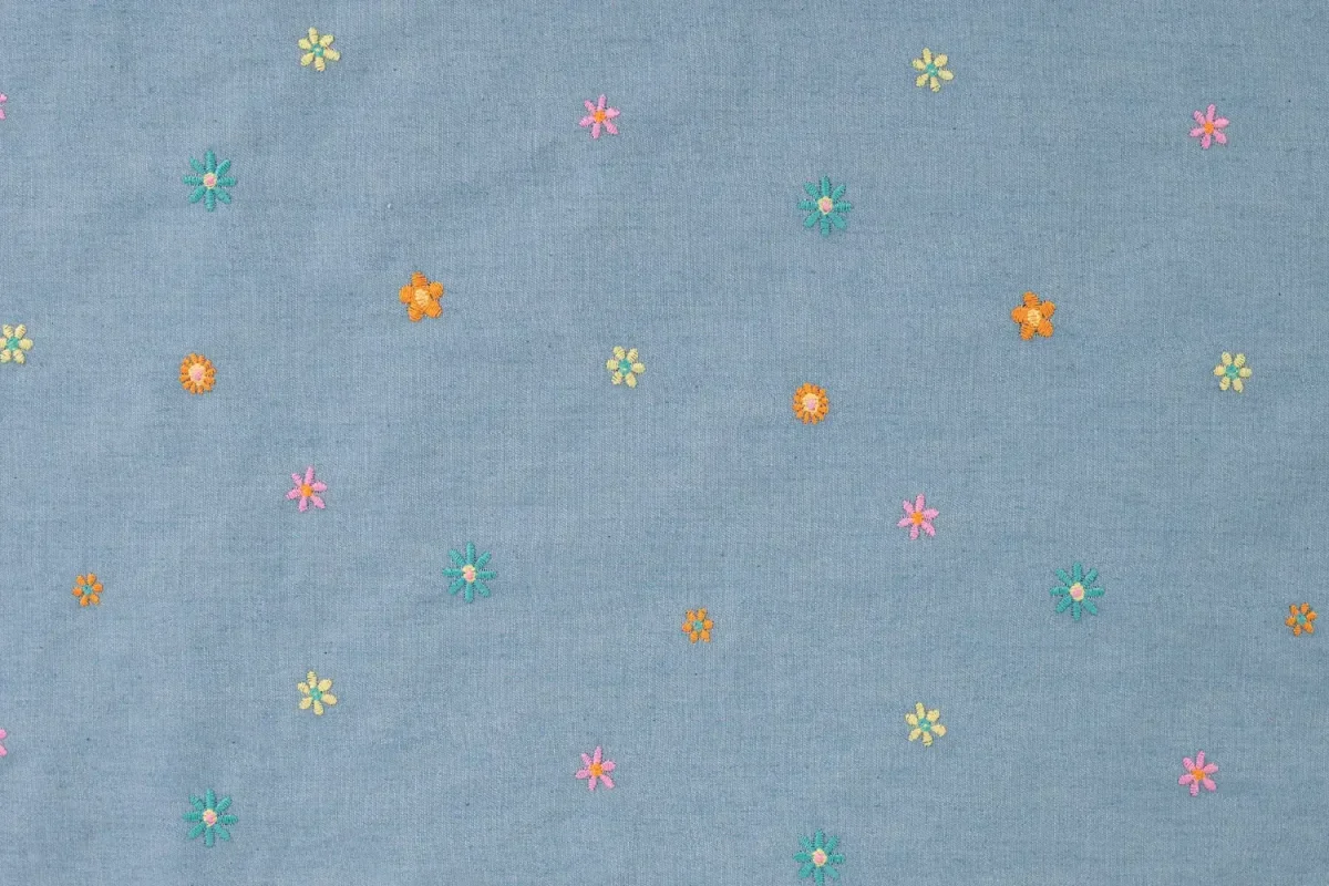 Mooie geborduurde jeans stof met een print van bloemetjes.