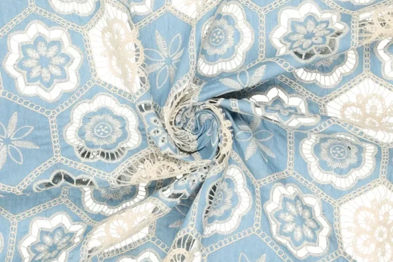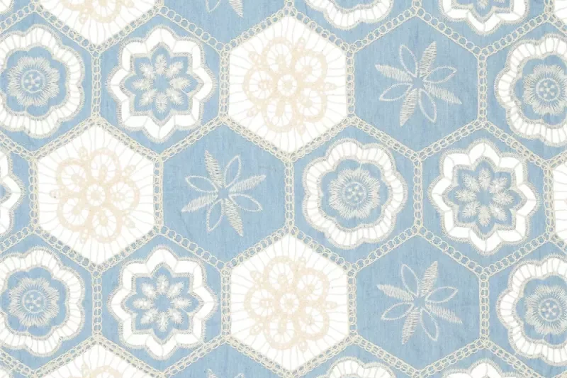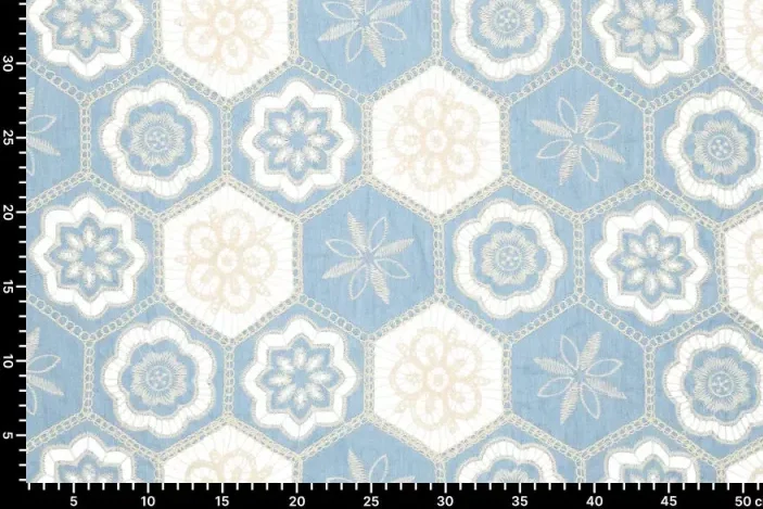 Mooie geborduurde katoen stof met een hexagon motief.