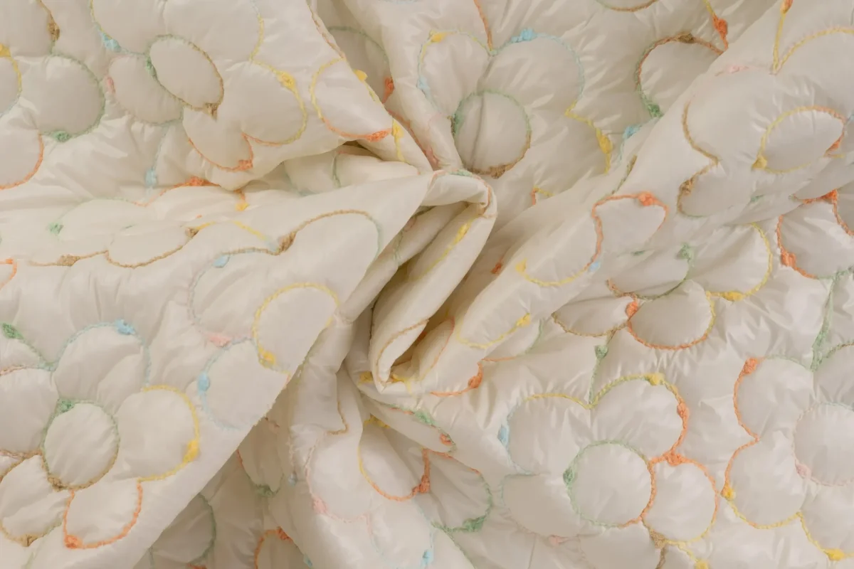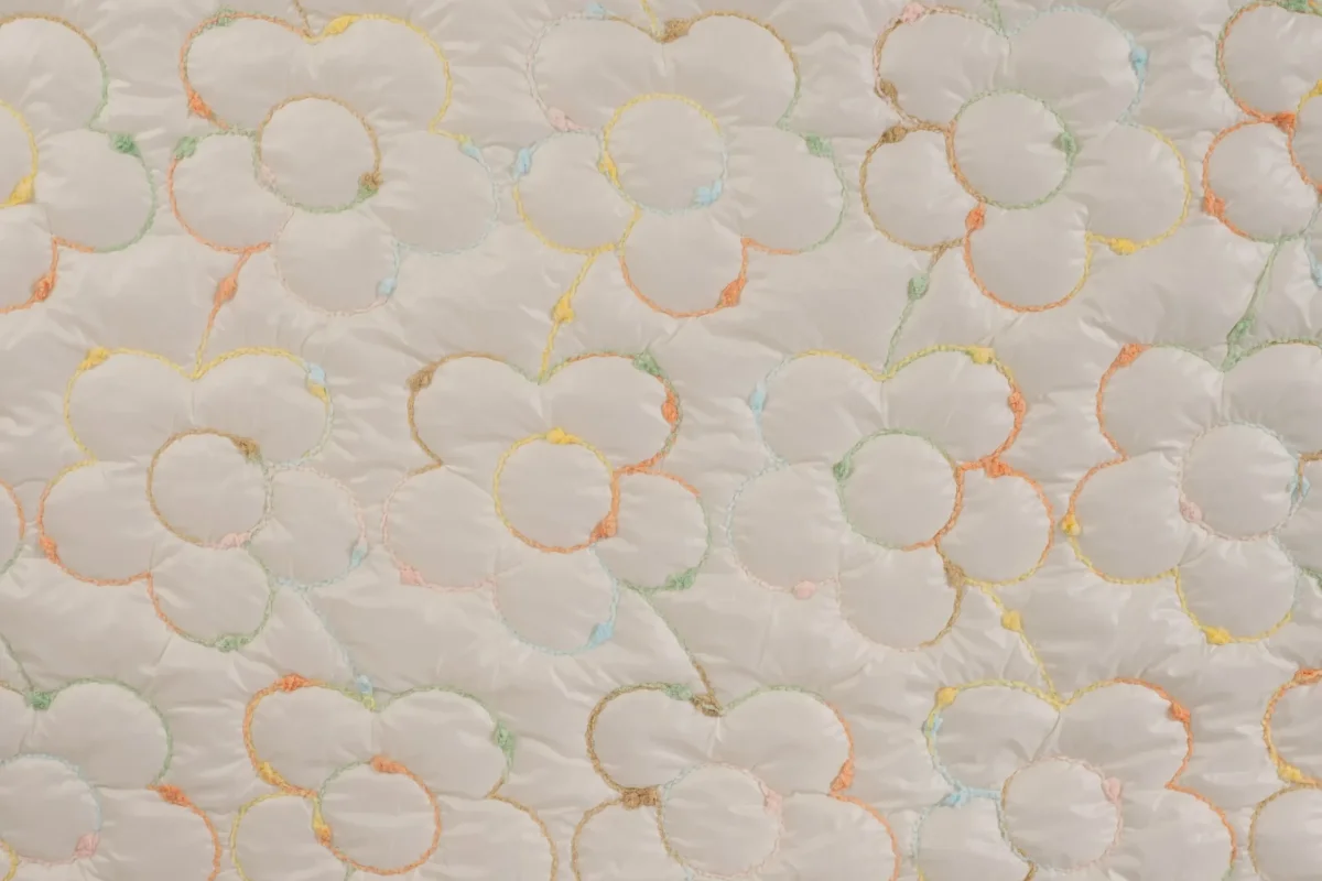 Mooie gestepte stof met een quilty look en een bloemen motief in pastel tinten.
