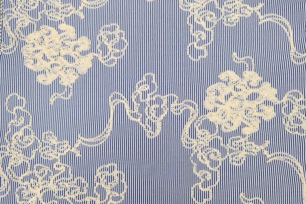 Mooie katoenen broderie stof met een streep motief met geborduurde krullen.