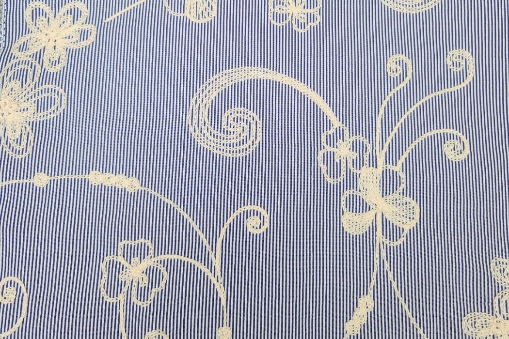 Mooie katoenen broderie stof met een streep motief met geborduurde sierlijke krullen.
