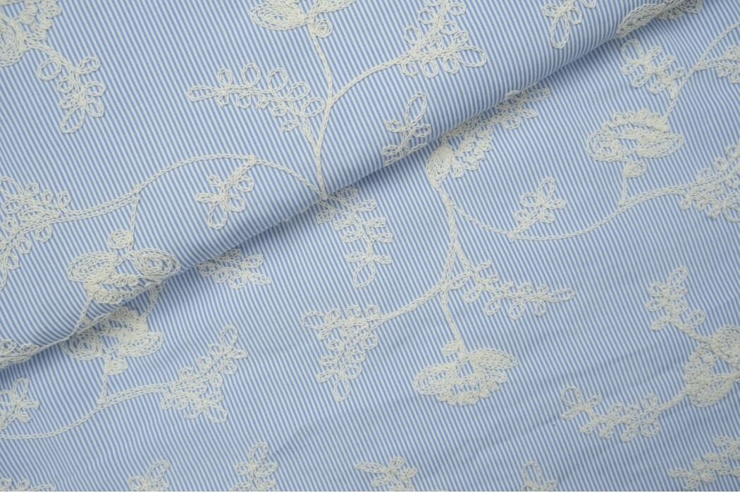 Mooie katoenen broderie stof met een streep motief met geborduurde takjes.
