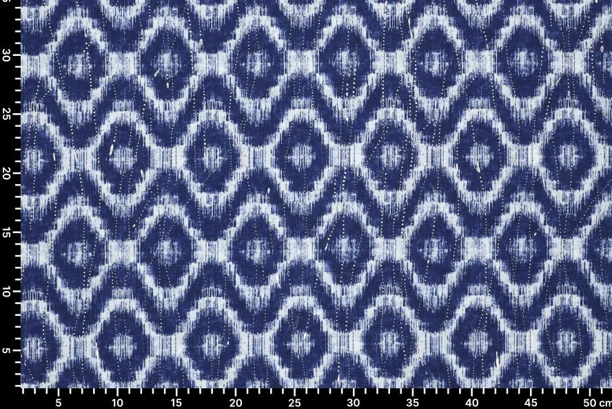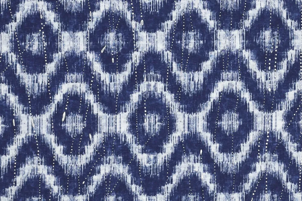 Katoen stof, soepel vallend, zigzag blok met zilveren druppels, blauw/zilver. Y283