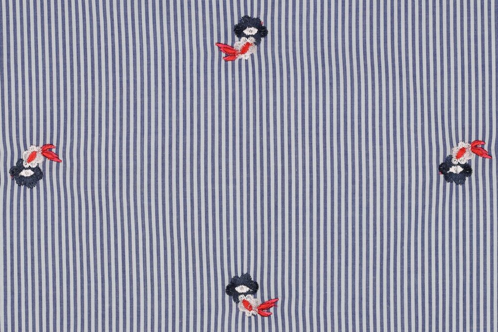 Mooie katoen stof met een streepje motief met geborduurde bloemen.