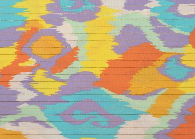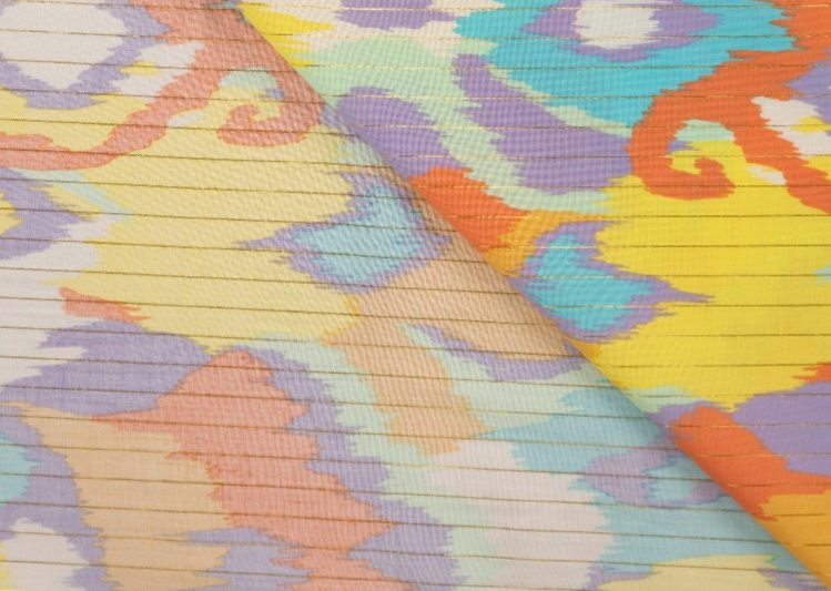 Katoen voile stof, fantasie print met gouden lurex streepje, geel/lila/paars/groen. X030