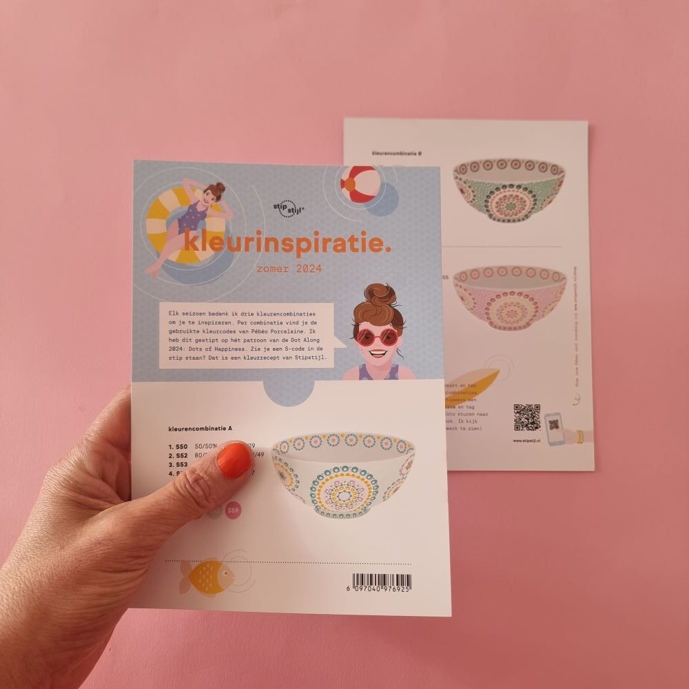 Elk seizoen bedenk ik drie kleurencombinaties om je te inspireren. Per combinatie vind je de gebruikte kleurcodes en eventueel verfverhoudingen op een Stipstijl patroon. Voor deze zomer is dat hét patroon van de Dot Along 2024: Dots of Happiness. Krijg onder andere verfrecepten voor oudroze, helder turquoise en warm geel.