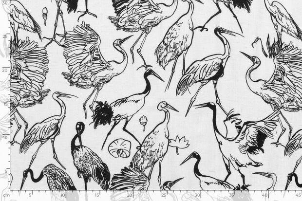 Mooie linnen viscose stof met een print van getekende struisvogels en reigers.