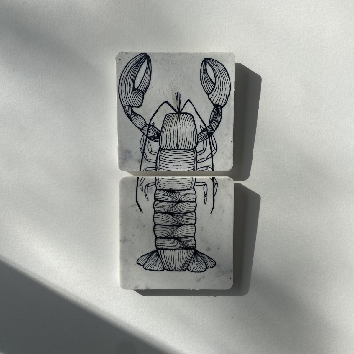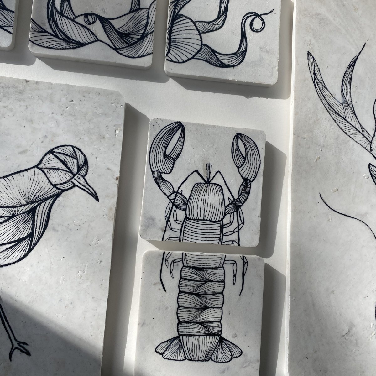 De fine line artworks worden met de hand met acrylmarkers gezet op platen gemaakt van 100% recycled plastic. Hiervoor werken we samen met Circlefied, Jutfabriek Terschelling en TZO.