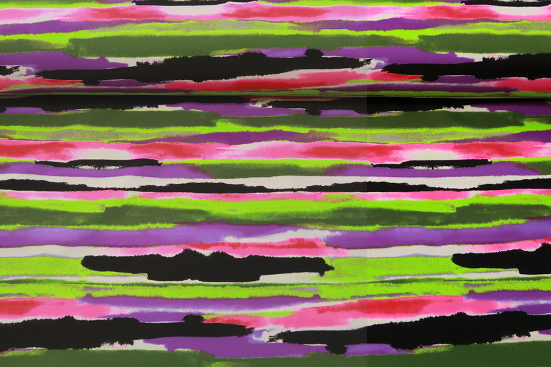 Lycra stof 4 way stretch, aquarel streep print, zwart wit, fuschia, groen X2503