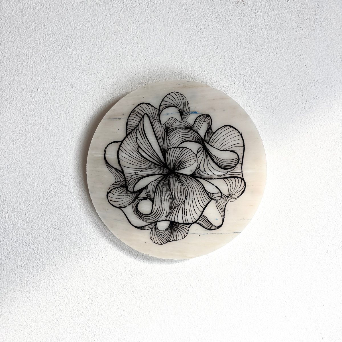 Studio Tosca werkt de plaat vervolgens af en zet er met acrylmarkers de fine line artworks op. Het werk kenmerkt zich door het spel van fijne lijnen. Deze lijnen nemen je stuk voor stuk mee. Brengen je verder of juist terug naar de basis. Bij elkaar vormen ze een geheel, zoals het leven.