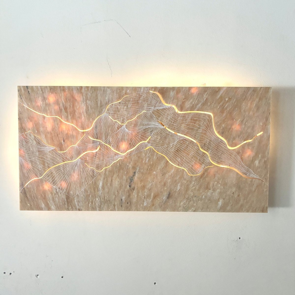 Dit artwork is onderdeel van de collectie ‘Sunset Wandering’. Een collectie met fine line art op 100% plastic afval van het strand van Terschelling. De collectie is geïnspireerd op de zon die onder- en ook altijd weer op komt! ☀️ De gehele collectie bestaat uit werken met led-licht; alsof je de zon op de duinen en zee weerspiegeld ziet!