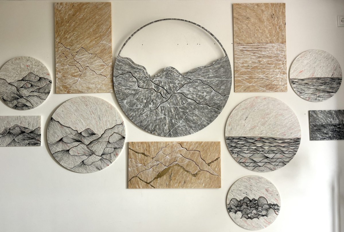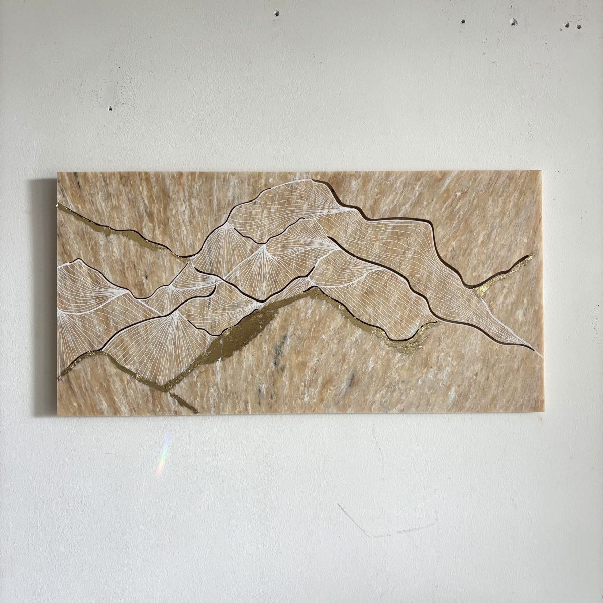 Studio Tosca werkt de plaat vervolgens af en zet er met acrylmarkers de fine line artworks op. Het werk kenmerkt zich door het spel van fijne lijnen. Deze lijnen nemen je stuk voor stuk mee. Brengen je verder of juist terug naar de basis. Bij elkaar vormen ze een geheel, zoals het leven.
