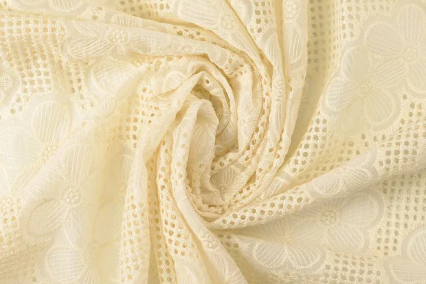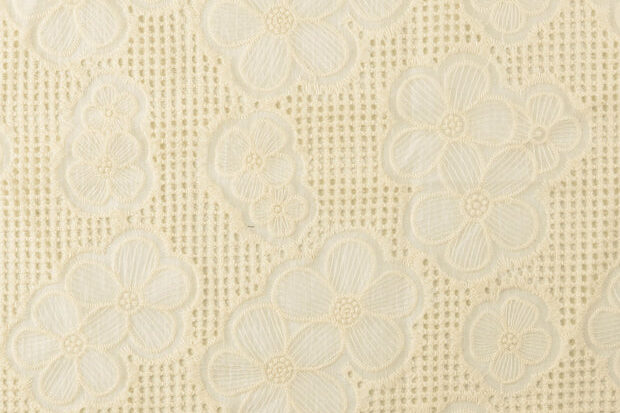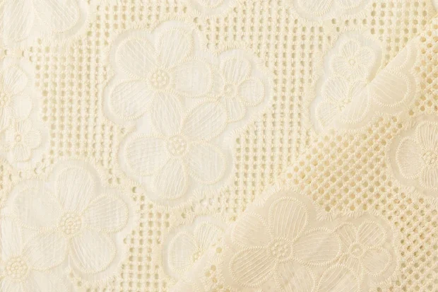 Mooie opengewerkte kant stof met bloemen op open ruitjes.