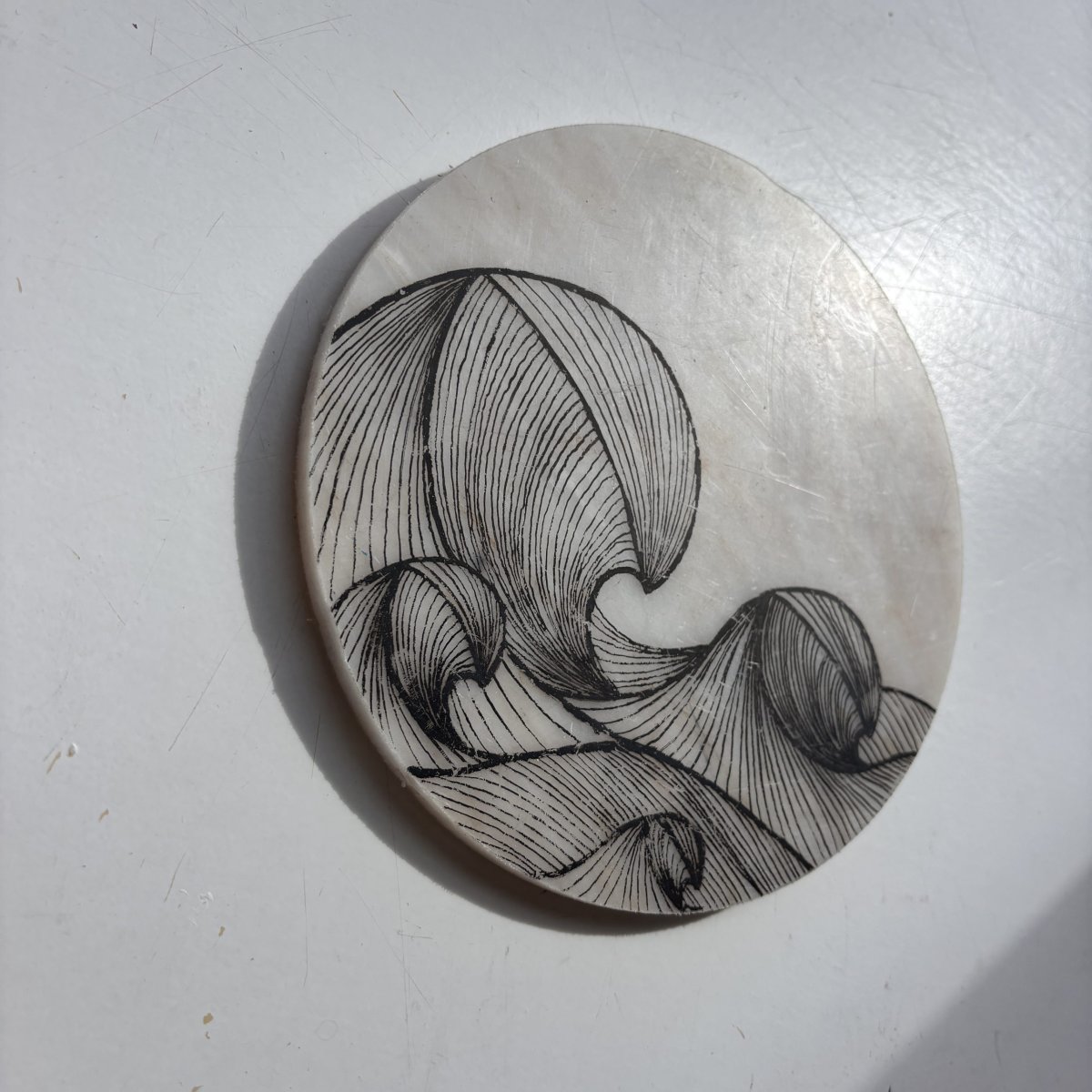 Studio Tosca werkt de plaat vervolgens af en zet er met acrylmarkers de fine line artworks op. Het werk kenmerkt zich door het spel van fijne lijnen. Deze lijnen nemen je stuk voor stuk mee. Brengen je verder of juist terug naar de basis. Bij elkaar vormen ze een geheel, zoals het leven.