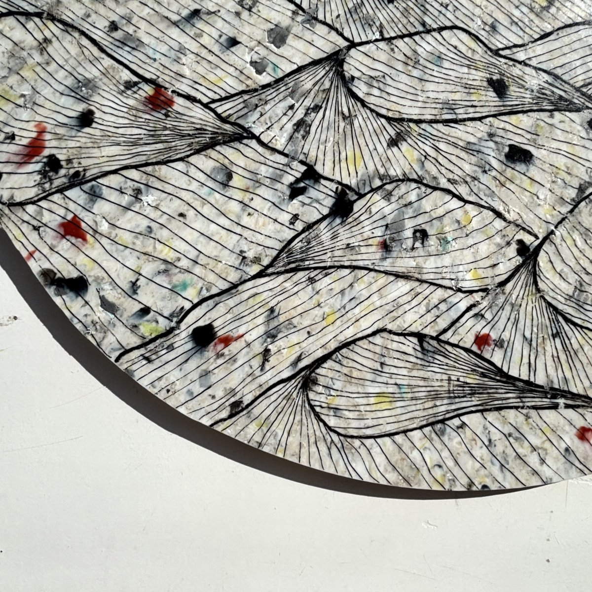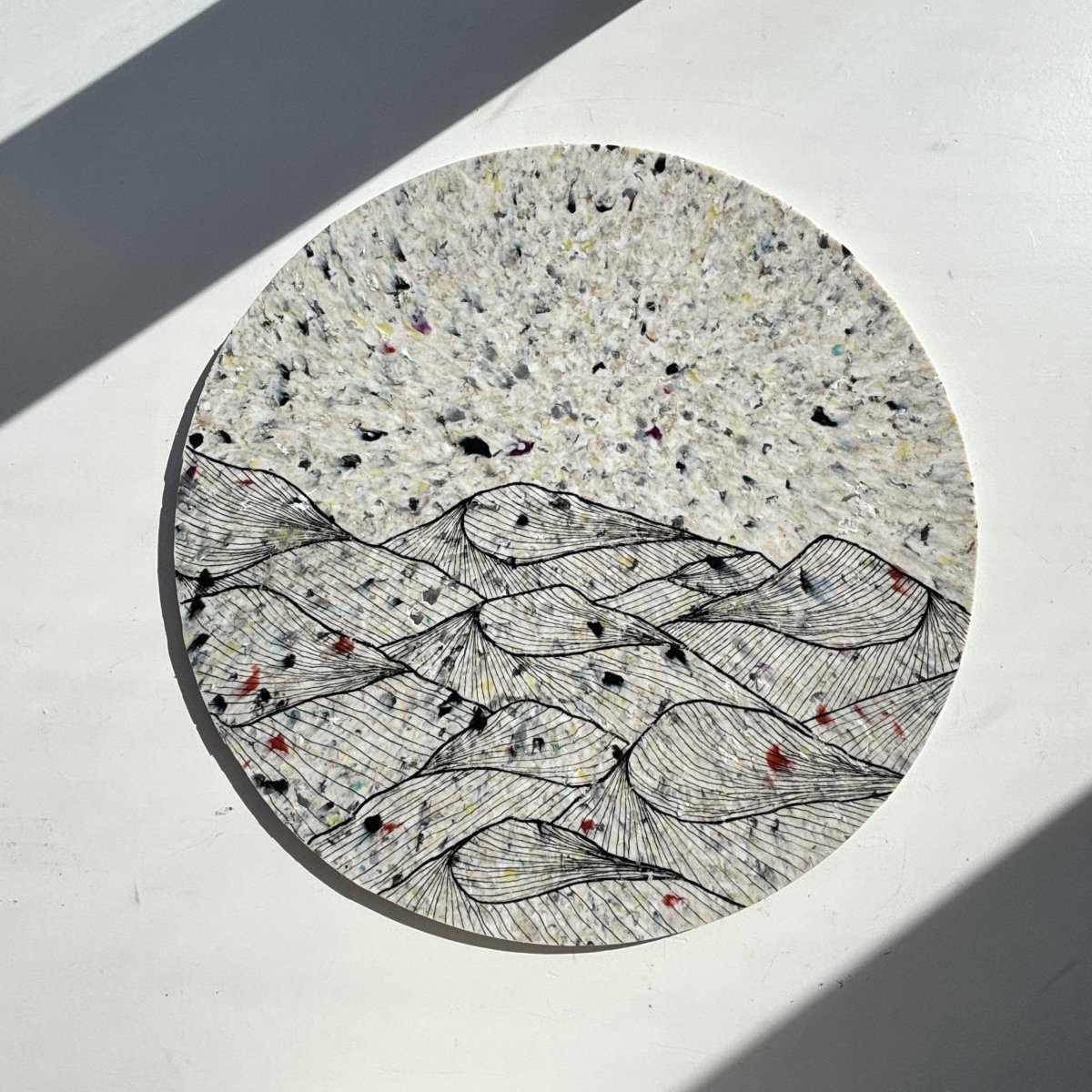 Studio Tosca werkt de plaat vervolgens af en zet er met acrylmarkers de fine line artworks op. Het werk kenmerkt zich door het spel van fijne lijnen. Deze lijnen nemen je stuk voor stuk mee. Brengen je verder of juist terug naar de basis. Bij elkaar vormen ze een geheel, zoals het leven.