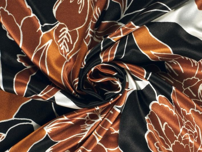 Mooie soepel vallende satijn stof met een print van grote bloemen.