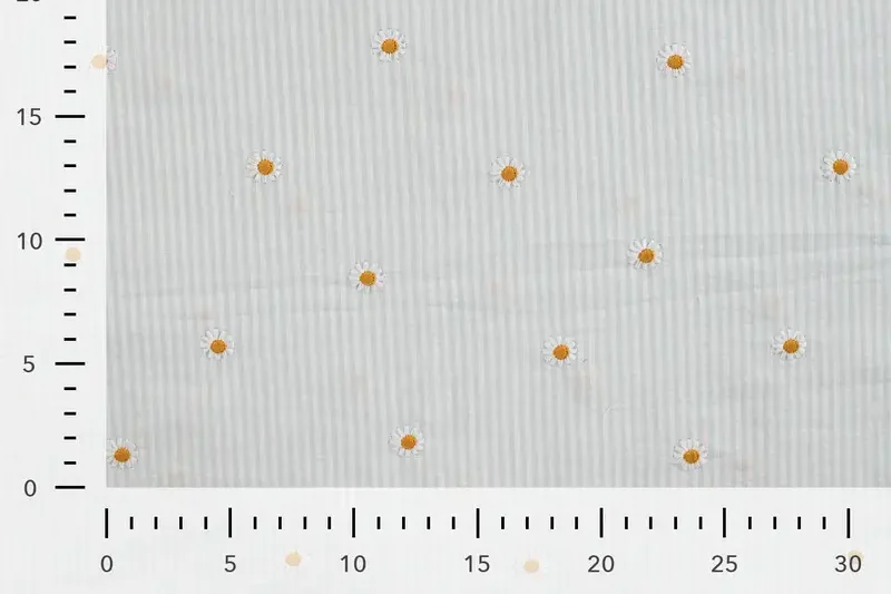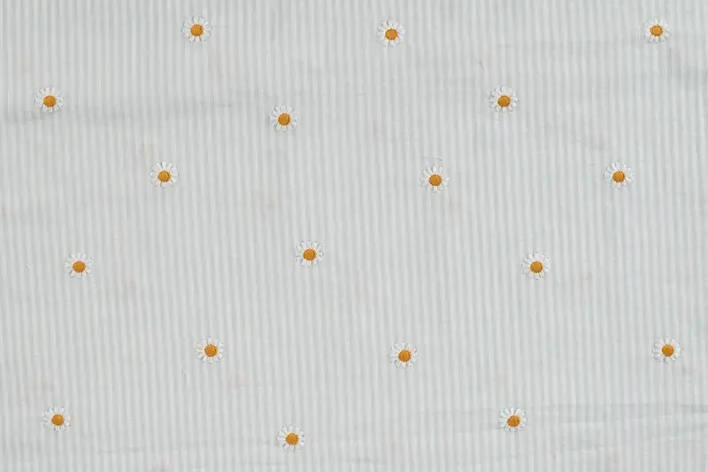 Mooie seersucker streep stof met geborduurde madeliefjes.