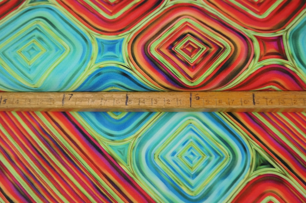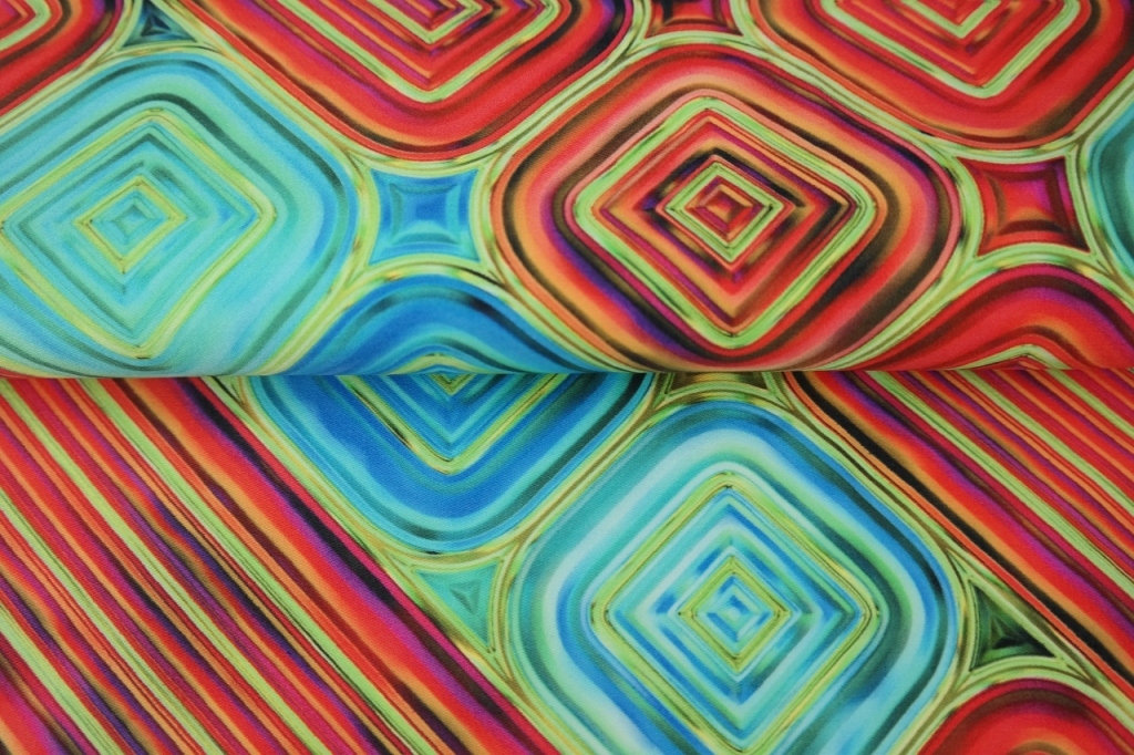 Stenzo katoen stretch satijn stof, grafische fantasie blokkenprint, rood/blauw/groen. Y465