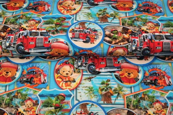 Mooie katoenen tricot stof van het merk Stenzo met beertjes, kikkers en brandweerauto’s.