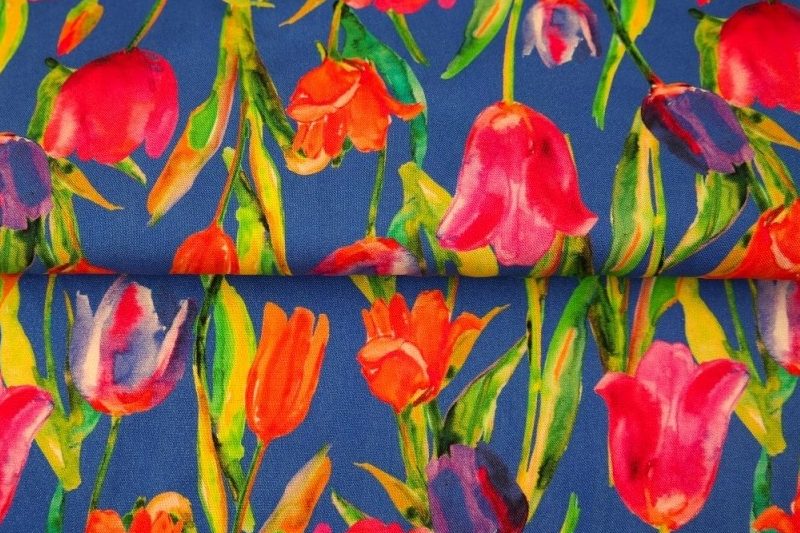 Mooie rekbare en soepel vallende tricot katoen stof met een digitale print van tulpen van het merk Stenzo.