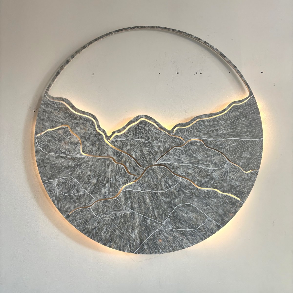 Dit artwork is onderdeel van de collectie ‘Sunset Wandering’. Een collectie met fine line art op 100% plastic afval van het strand van Terschelling. De collectie is geïnspireerd op de zon die onder- en ook altijd weer op komt! ☀️ De gehele collectie bestaat uit werken met led-licht; alsof je de zon op de duinen en zee weerspiegeld ziet!