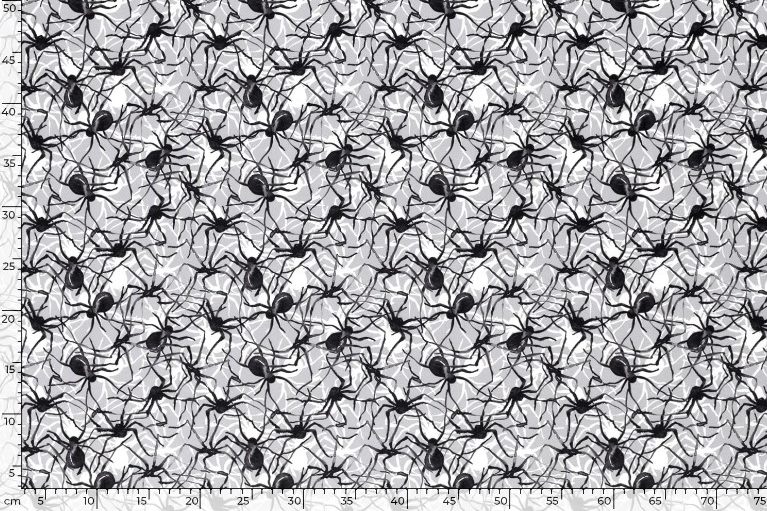 Mooie glanzende trevira jersey stof met een print van spinnen.