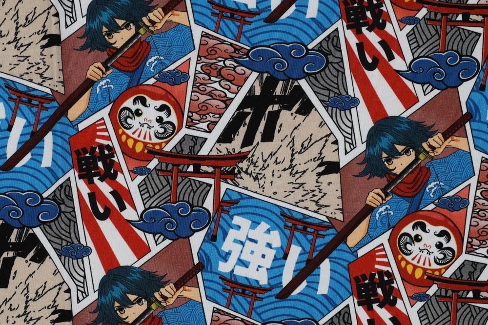 Mooie soepel vallende en rekbare katoenen tricot stof met een print van manga jongens.