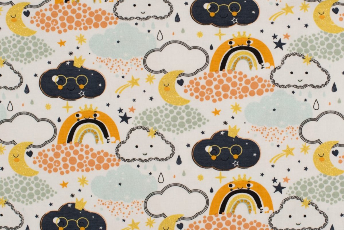 Veel van deze stoffen hebben een leuk kinderlijk printje zoals bij deze tricots met lieve wolkjes en regenboogjes.