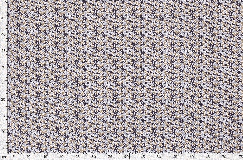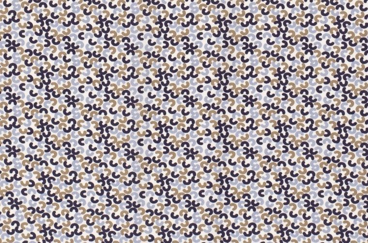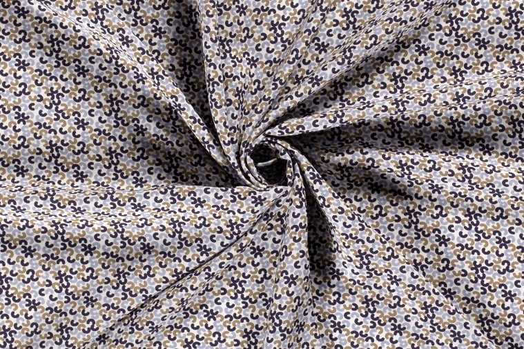 Viscose poplin stof, abstracte halve cirkels, wit/blauw/camel. C01004