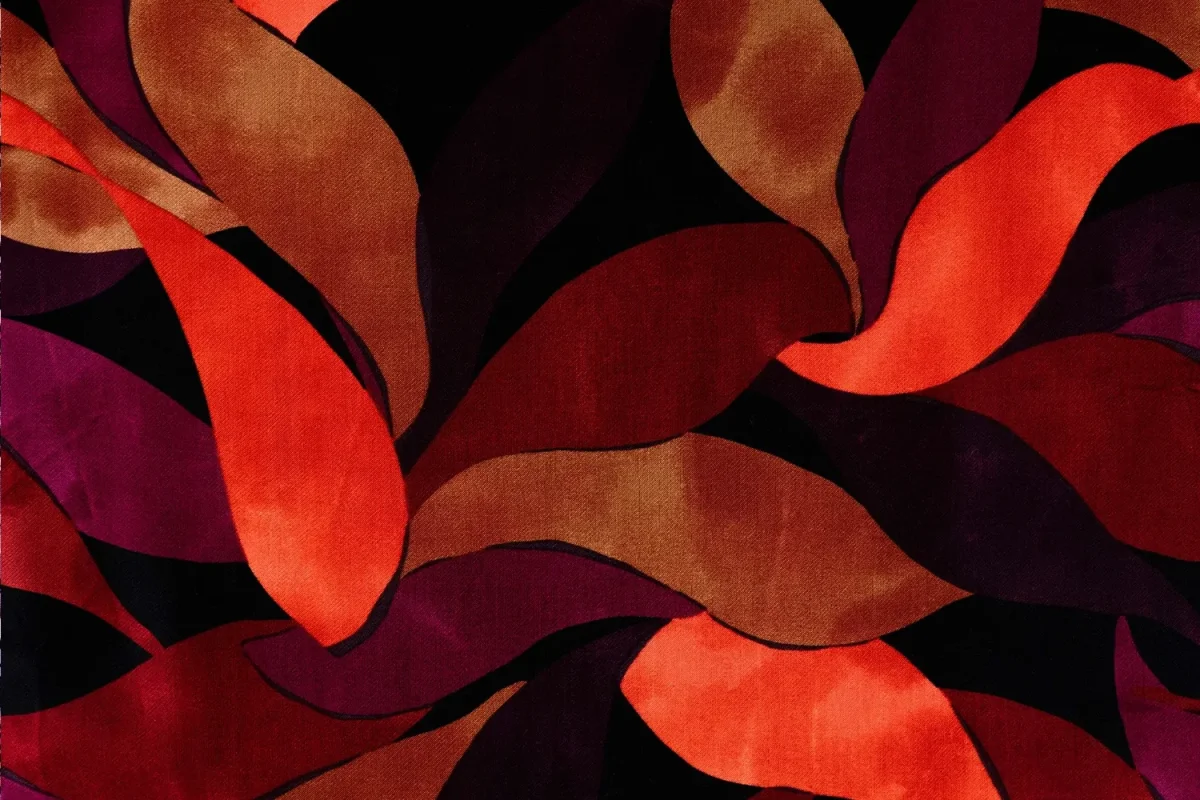 Viscose satijn stof, bladprint, donkerrood/zwart/oranje. Y764