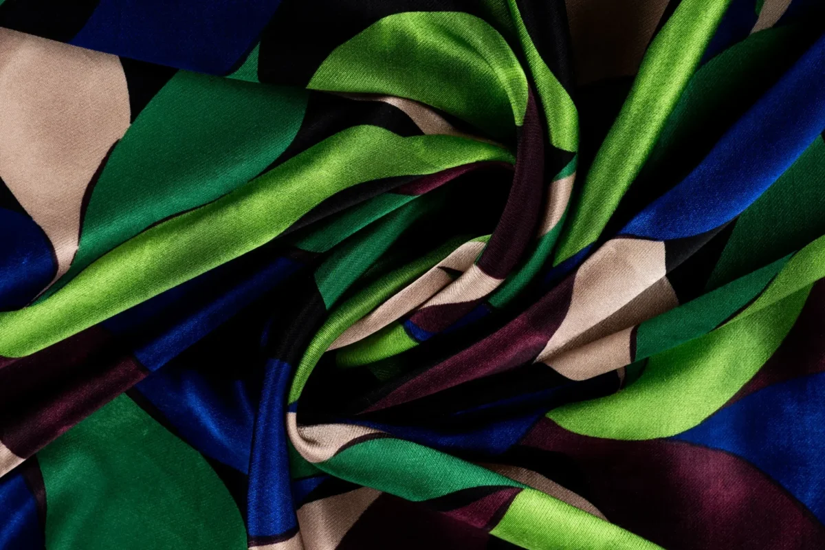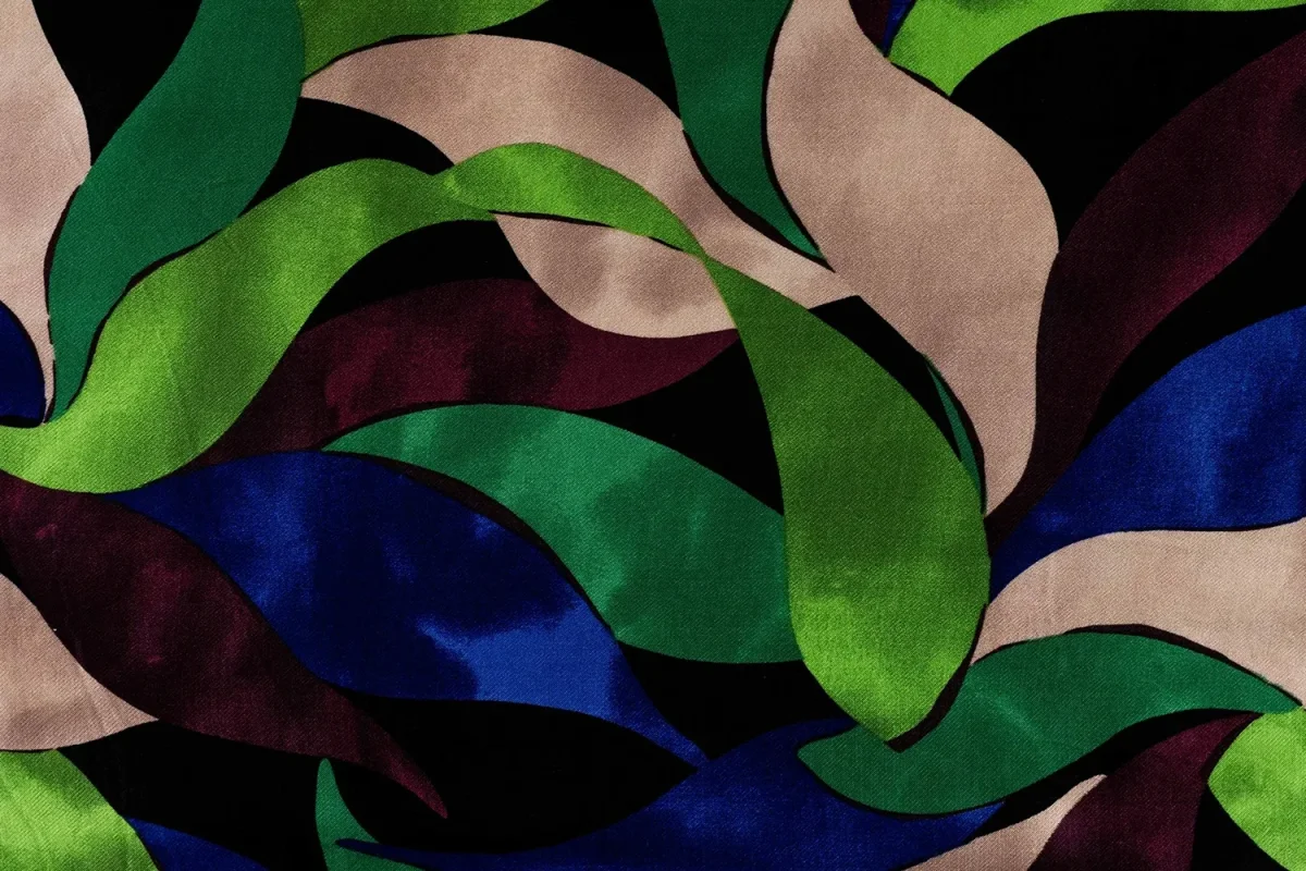 Mooie viscose satijn stof met een bladprint.