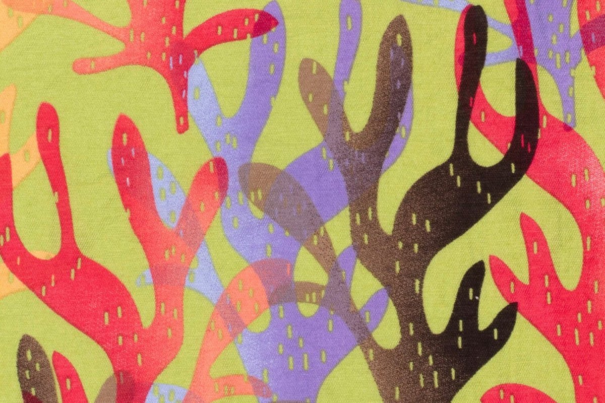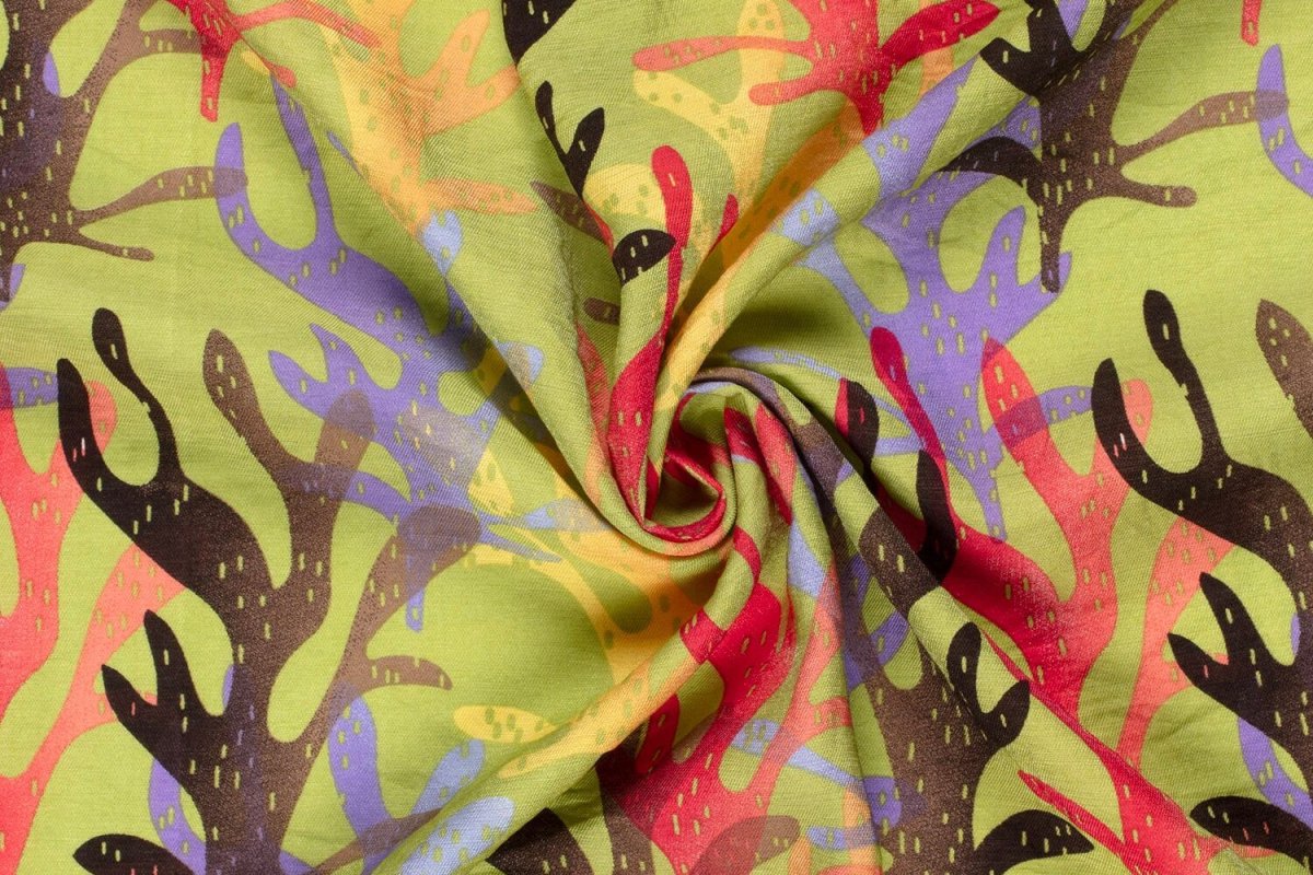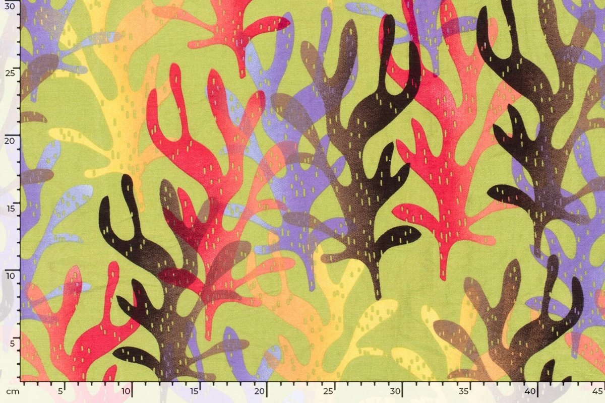 Viscose stof, bladprint, groen/geel/lila/roze. Y254
