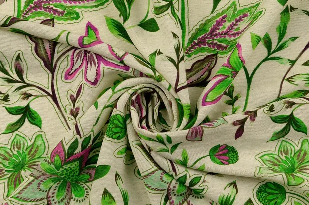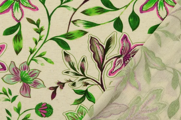 Viscose stof, bloemenprint, offwhite/groen/cerise. Y65