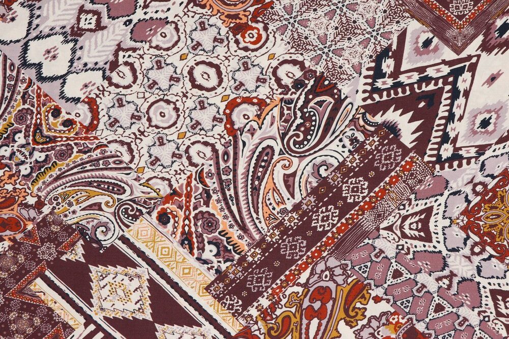 Mooie viscose stof met een schuine blokken met verschillende prints.
