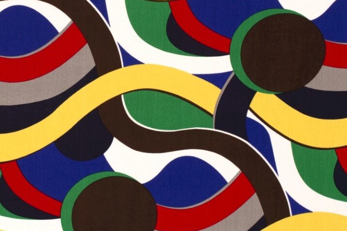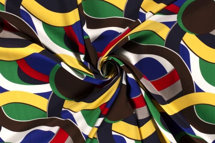 Mooie soepel vallende en luchtige viscose stof met een print van golven en cirkels.