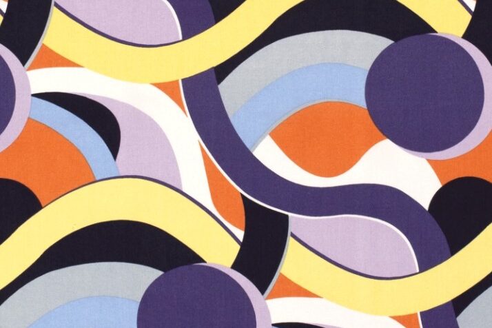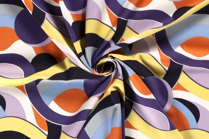 Mooie soepel vallende en luchtige viscose stof met een print van golven en cirkels.