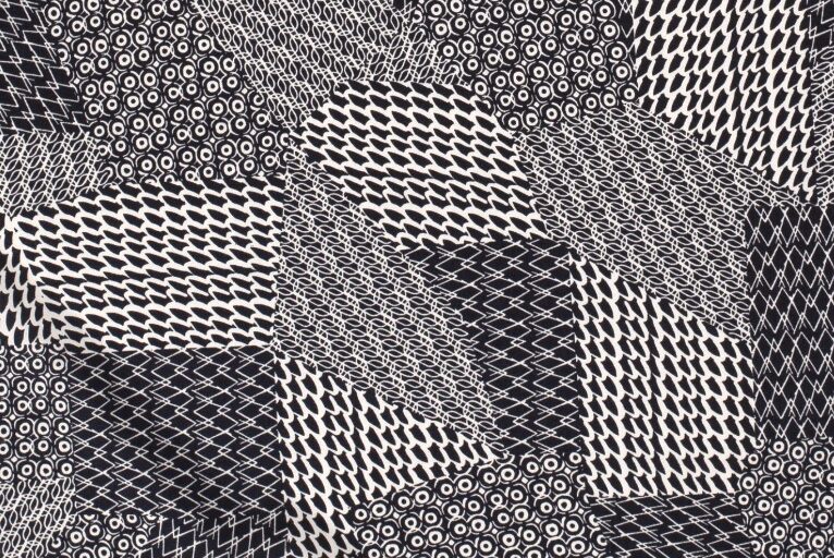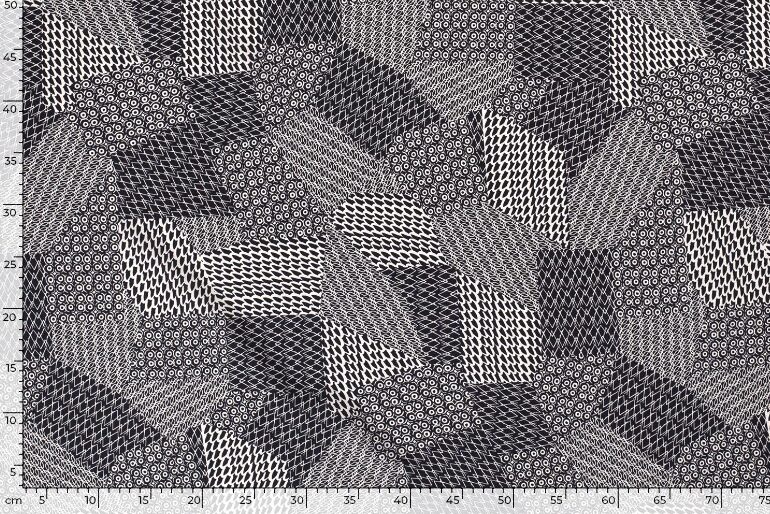 Mooie viscose stof met verschillende fantasie figuren in blokken print.