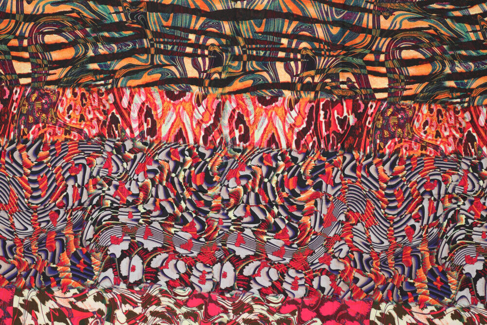 Mooie viscose stof met verschillende prints in banen.