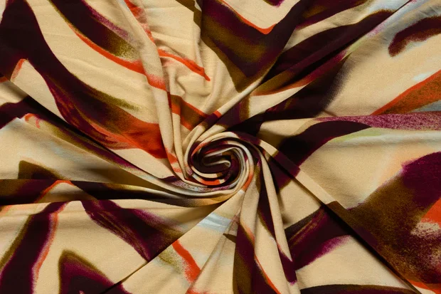 Viscose tricot stof, abstracte zebraprint, crème/bordeaux/groen/oranje. P370
