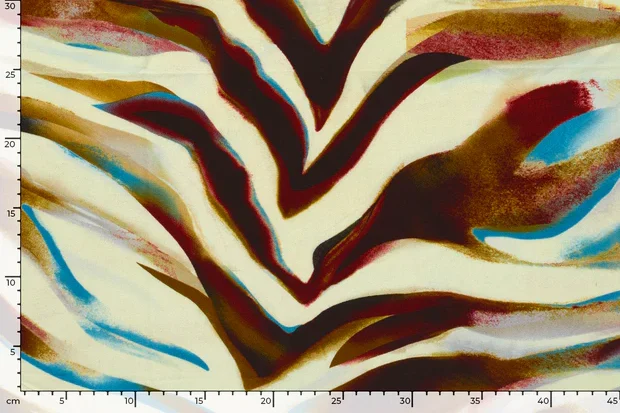 Viscose tricot stof, abstracte zebraprint, offwhite/groen/rood/blauw. P371A