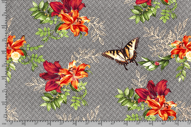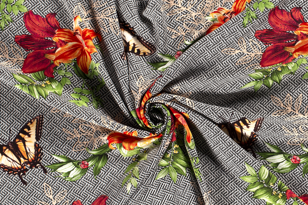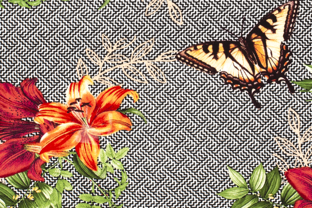 Mooie viscose twill stof met lelies en vlinder op een zwart met witte achtergrond.