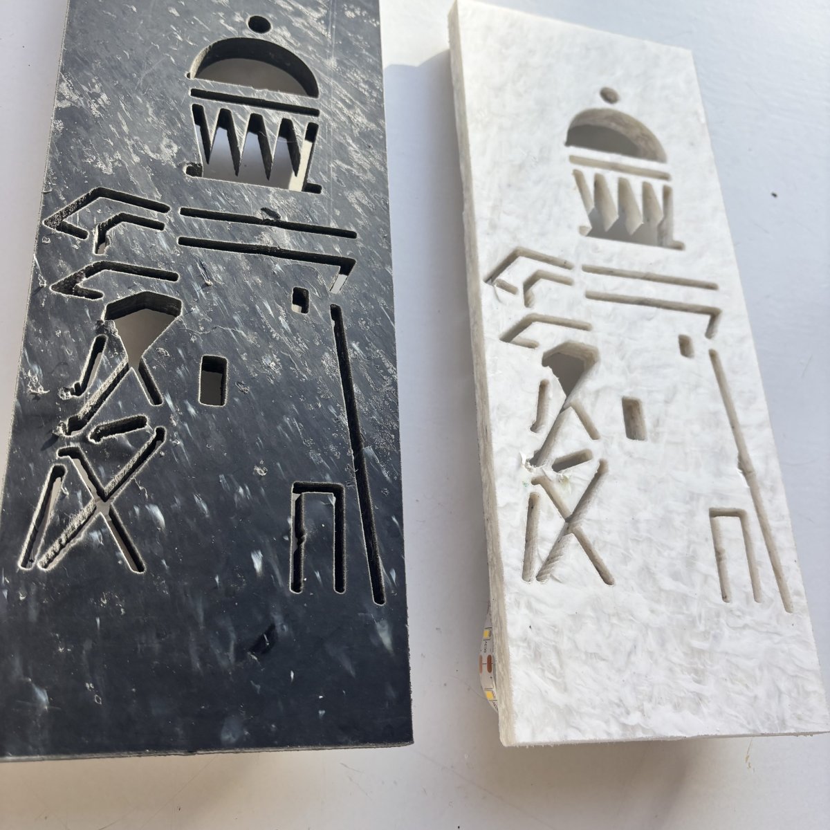 De fine line artworks worden met de hand met acrylmarkers gezet op platen gemaakt van 100% recycled plastic.